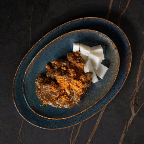 Indonesië. Vegetarisch. Tempeh is een koek van soja in een licht pittige zoetzure tamarinde saus. Wij bereiden deze met trassi en is daarom niet vegan maar vegetarisch. Met lontong, rode peper en gebakken uitjes