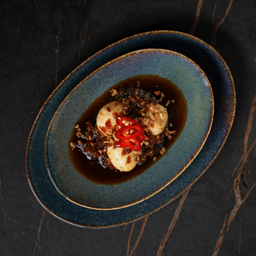 Gegrilde runderhaas in dunne plakjes gesneden. Geserveerd in een ponzu dressing en gegarneerd met lente ui, rode peper en gebakken uitjes. Koud geserveerd
