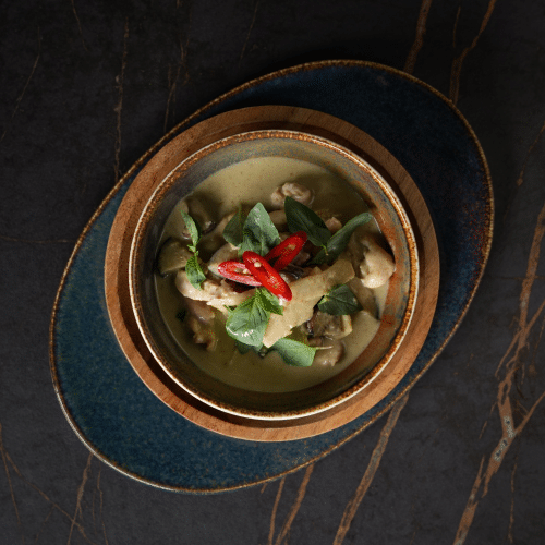Thailand. Kippendij in een pittig gekruide kokossaus, aubergine, bamboe en Thaise basilicum. Hier wordt geen rijst bij geserveerd